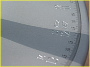 Functional descriptionOn a Bernhardt precision sundial, the time is read from an engraved number ring. The time can be read on the scale optionally in MET or MEST. The shadow is no longer cast by a skinny rod but by a thick roller that creates a broad shadow with two shadow limits. The time is read at the intersection of the advancing shadow limit to the number ring. The other limit is not considered. While the sun dips deeper each day from summer solstice to winter solstice, the sun beam scans the shadowcaster from the top downwards. Thus, each day, a different height of the shadowcaster generates the shadow that strikes the number ring. Each height of the shadowcaster, therefore, represents a certain day. The shadowcaster is held at this height stronger or weaker correspondingly to the time equation applicable to this day. The shadow on the number ring is thereby automatically moved ahead or behind by as many minutes as prescribed by the time equation. Once the sun has reached its deepest level at the winter solstice, the shadowcaster is substituted by a second one that now, on the basis of another curvature, compensates the error when the sun begins to ascend.