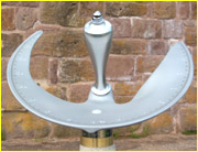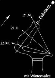 The wing tips of the body are turned to the equator level in such a manner that they create only a thin shadow at the equinoxes. After few days only, the sun shines passes through under the wings mornings and evenings. Thus, even during this time, an exact reading is possible. The surface of the number plate is inclined at each point in such a way that the sun strikes the number plate from above even at sunrise. |